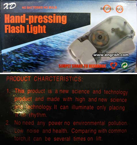 Actually, this squeeze-type is a pretty good design for a “Faraday flashlight”. The kind you crank to charge requires 2 hands to operate, and the kind you shake up and down…well, that one REALLY makes you look like you’re wanking.