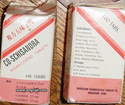 After being hospitalised for a broken reg, I took to reading about cosmology and doing cryptic crosswords. Now I have brain fag! Thank goodness I found Co-Schisandara! Just two tablets each time the fag comes on, once, twice, thrice or even trice daily. Thanks, Kwangchow Pharma! Brain fag no more!
