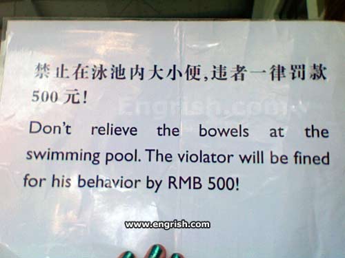 From my limited mandarin, I can only guess some of the words in the Chinese phrase: “Please don’t piss or take a dump inside the pool or you’ll be fined/punished 500RMB”. Correct me if I’m wrong. 🙂