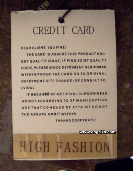 Dear credit card: I fine, how you? You still studying English? Good luck!