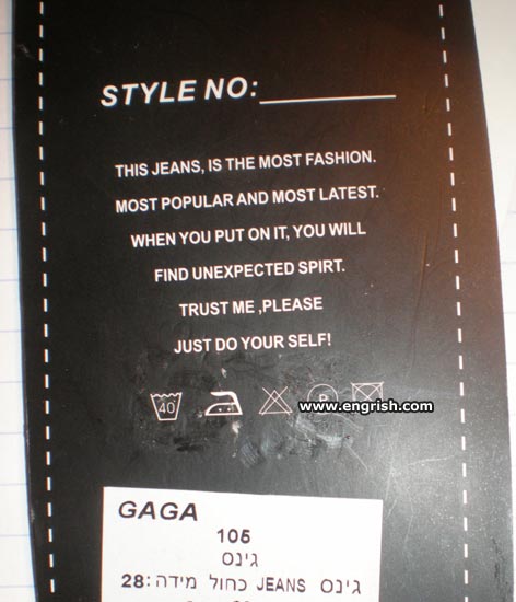But the bright and perky cheerful rainbow & butterflies Engrish sounds distinctly like Japanized Engrish to me. I’m going to assume that the jeans were imported from Japan.